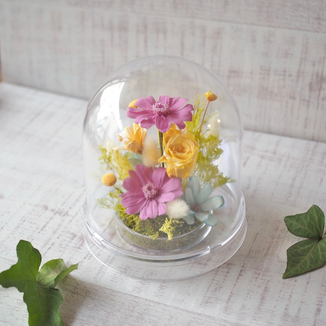 プリザーブドフラワー クッペルS(イエロー) デンマーク語でドーム、球体を意味するクッペル。コロンと可愛らしいアクリルドームに小さなバラをアレンジしました。ちょっとしたギフトにおすすめです。 サイズ:直径 8cm / 高さ 約8cm