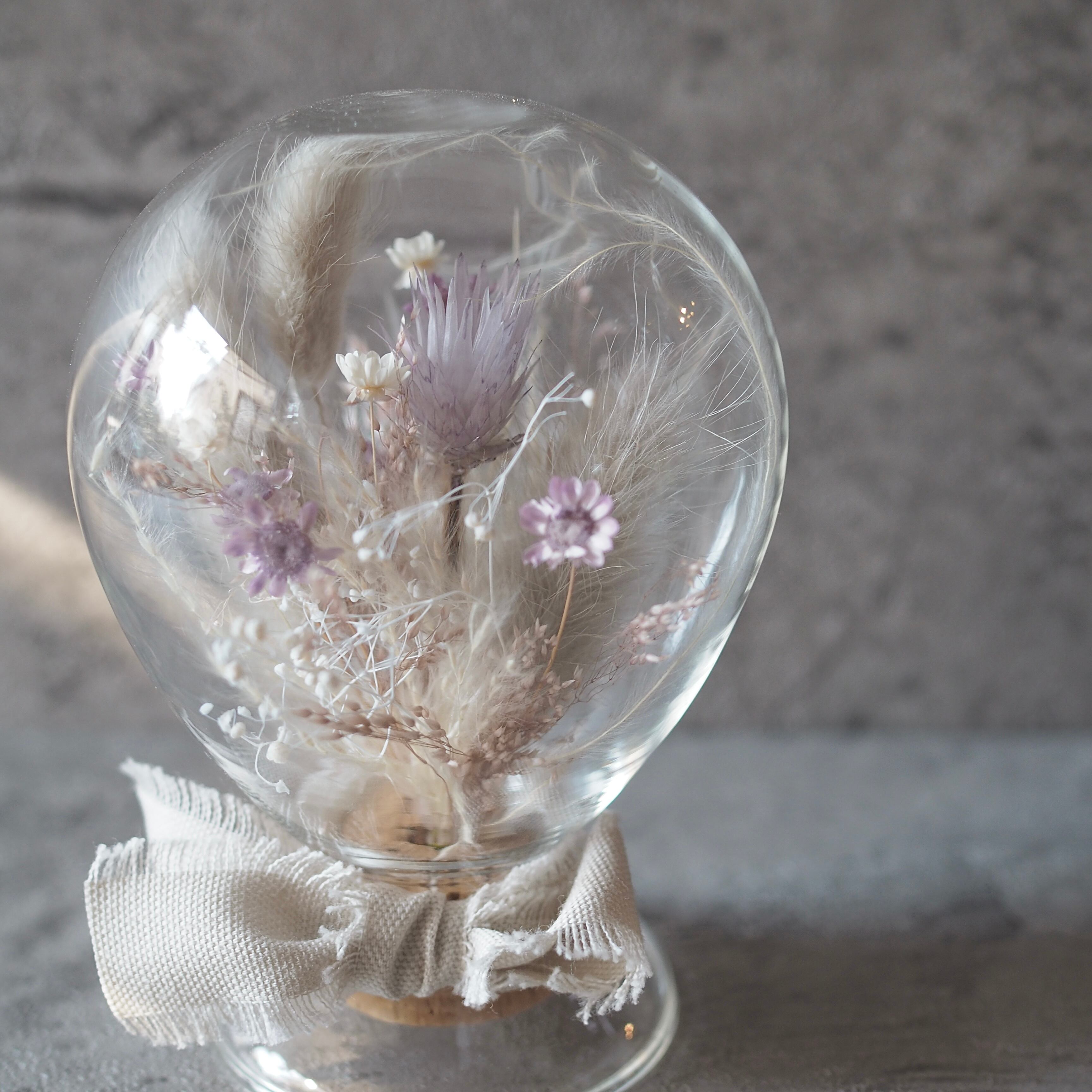 ドライフラワーを風船型のガラスの中にアレンジしました。
