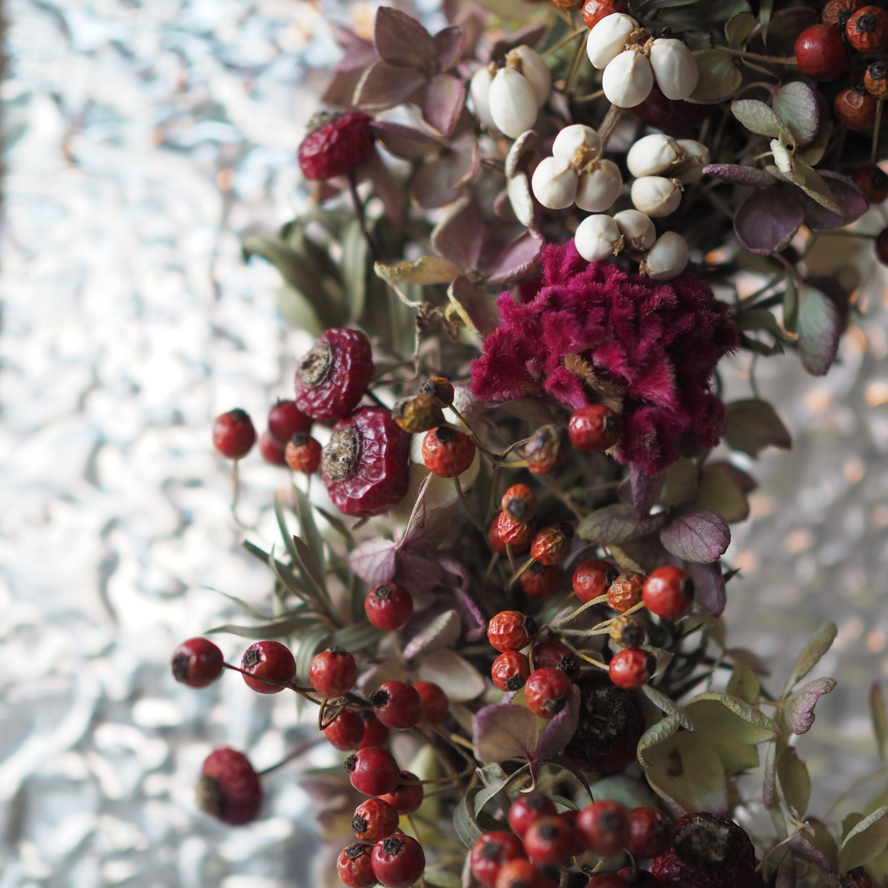 バラ実、ナンキンハゼ、ミナズキ、ケイトウなどを使ったリース。